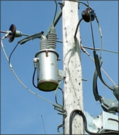 The transformer we offer is typically a two bushing primary, two bushing secondary 0.5kVA, 11,000/240-120V with the option of a fully insulated plug and socket secondary. These very compact sealed stainless steel devices are 260mm diameter, 680 mm high (including bushings) and weigh approximately 30kG. They are equipped with their own hanging bracket designed for pole mounting.